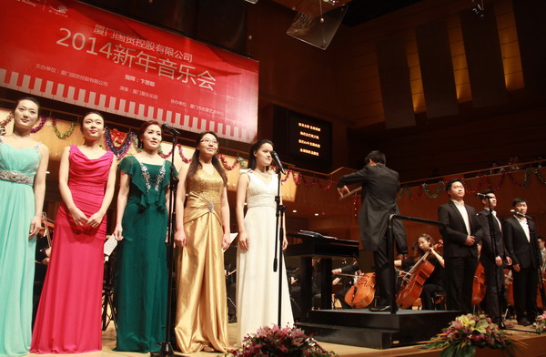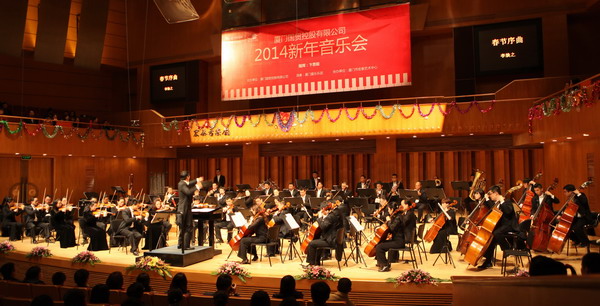 1230日晚,“国贸控股2014新年音乐会”在宏泰音乐厅举行。本场音乐会由厦门爱乐乐团青年指挥卞思聪执棒。音乐会以李焕之的《春节序曲》开场,既有施特劳斯、柴可夫斯基、比才等国外名家作品,亦有李焕之、鲍元恺的中式风格曲目,大气磅礴而又荡气回肠的音乐赢得了听众的阵阵掌声。在爱乐乐团的伴奏下,国贸控股公司的八名职工演唱了贝多芬第九交响曲的《欢乐颂》乐章,气势辉煌、明快,为观众带来了一场视听飨宴。