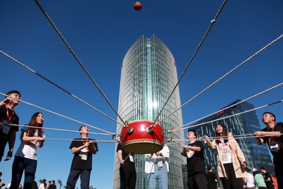 【动感颠球】每个人握紧手中的绳,劲往一处使,才能不让鼓上的球落下,就像守护我们共同的理念。
