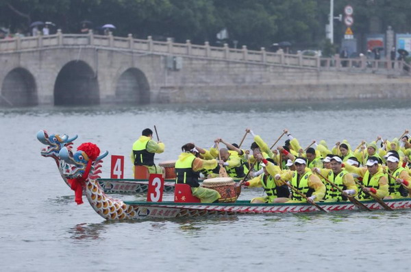 随着裁判员发令枪响,比赛开启了紧张激烈的竞赛单元。顿时,木桨翻飞,浪花朵朵。参赛选手们挥臂划桨、奋力拼搏、勇往直前。船上选手跟随鼓手的鼓点,喊着号子,铆足劲挥动着船桨,颜色鲜艳的龙舟劈波斩浪驶向前方。