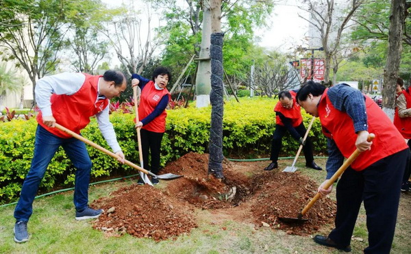 3点整,这场特殊的植树活动正式开始。挖土、施肥、浇水,志愿者们一个个忙得不亦乐乎。“志愿红”种下“希望绿”,身着红马甲的志愿者穿梭在一棵棵亟待舒展的绿色苗木间,构成了一幅“红绿交融”的美好春景图。