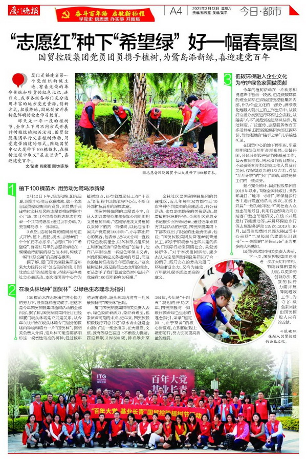 100棵苗木在志愿者们齐心协力的努力下,很快就种植完成了,但这不是今年国贸控股集团植树活动的全部内容。据了解,国贸控股集团近日已经和厦门坂头林场建立共建关系,从今年3月开始在坂头林场专门划分的区域内种植和培育一片“国贸林”,据相关负责人介绍,这片林可能选购落羽杉这一观赏性较高的树种,经过数年的培育栽种,坂头林场内将有一片风景独特的“国贸林”出现。