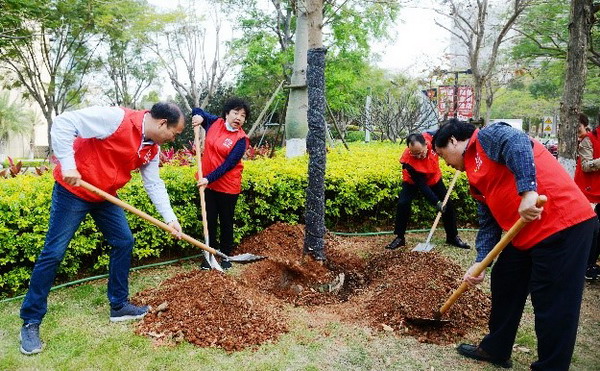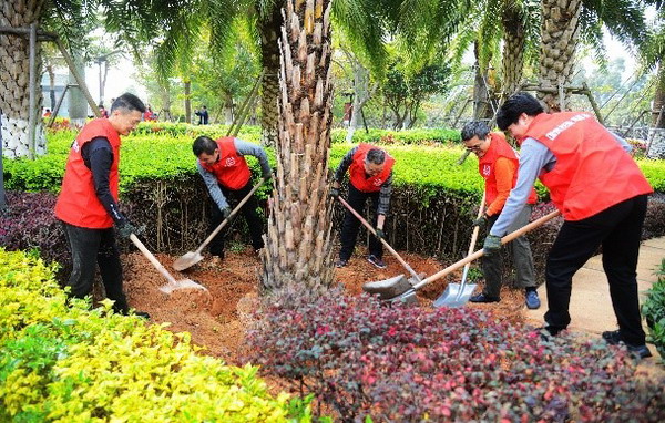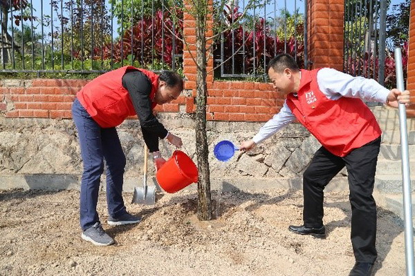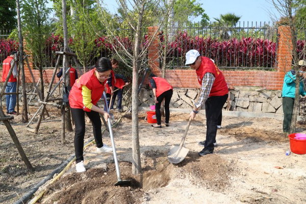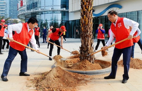 在3月12日植树节当天, 40名来自国贸控股集团的党员、团员携手共建单位金林社区的志愿者相聚国贸中心广场,种下100棵绿植,献礼建党100周年。