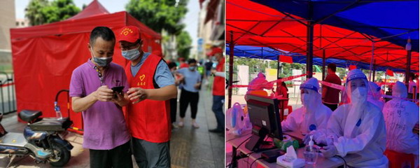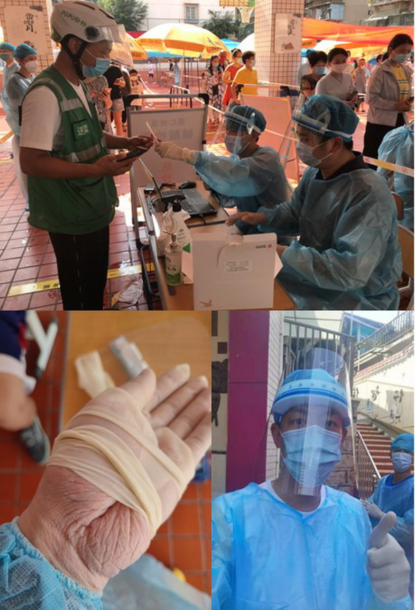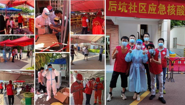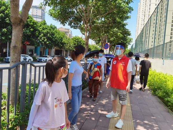 在炎夏的高温中,志愿者们严格遵照现场医护人员的安排,全副武装参与到疫情防控和核酸检测的宣传引导、秩序维护、物资分发和信息录入等工作中。