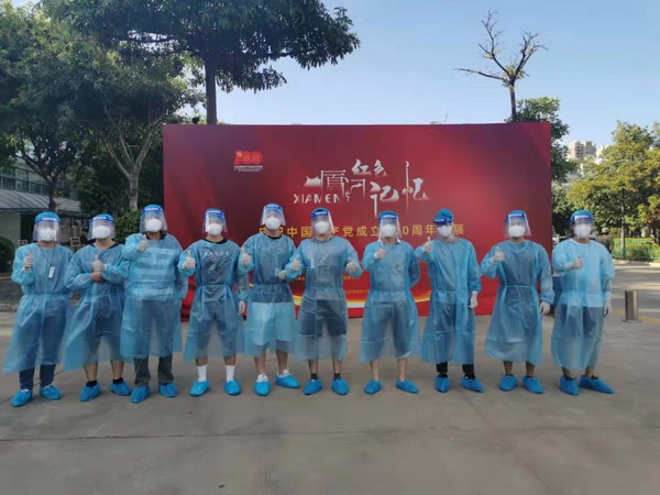 中秋节期间,国贸会展志愿者分批支援翔安高速路口、后坑社区、屿后西社区核酸检测志愿服务,协助人员分流、路线指引、程序咨询、维持秩序等工作,志愿者们有的身着防护服,有的身披红马甲,顶着烈日,冒着酷暑,不顾疲惫,穿梭在人群中,助力社区核酸检测工作平稳、高效、有序的开展,在高温下连续奋战7个多小时,圆满完成核酸检测志愿工作。党员职工志愿者们还积极履行“双报到”工作,就近参加了莲云社区云顶学校、金尚社区金尚小区核酸检测等志愿服务。